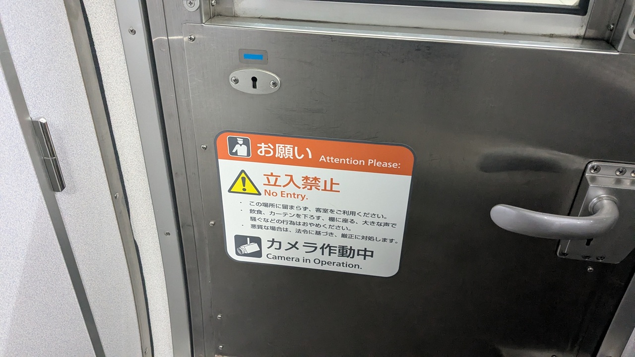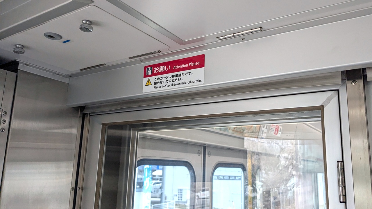 前述の通り、当初は助士席側スペースが旅客にも開放され、乗務員室内を比較的自由に観察することができていました。しかし、長時間の占領・前面貫通扉のロックを外して閉める・助士席側背面窓や乗務員扉のカーテンを閉める等、一部の旅客による迷惑行為が多発していました。そのため2023年ごろから助士席側スペースは立入禁止扱いとなったのに加え、各所にいたずら防止の注意書きも順次追加されました。