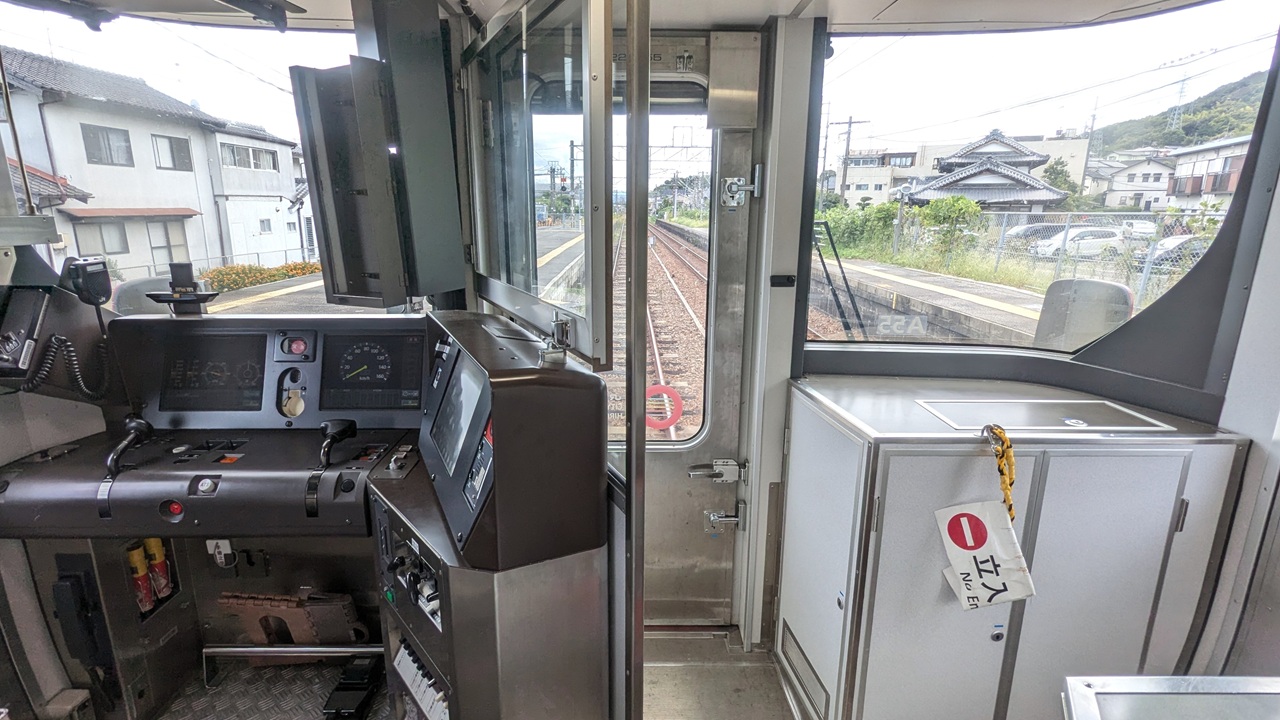 運転台パネル右側上部には仕切り窓が設けられているため、右方向の視界は窓越しになるものの、本形式が置き換えた国鉄型車両と比べれば遮蔽物が少なく見やすそうです。左側上部に設けられたワイパーのスイッチや、左側ワンマン用ドアスイッチとの干渉を避けるためか傾けて配置された列車無線機などに、操作性と視認性を両立しながらスペースを最大限活用した工夫が感じられます。