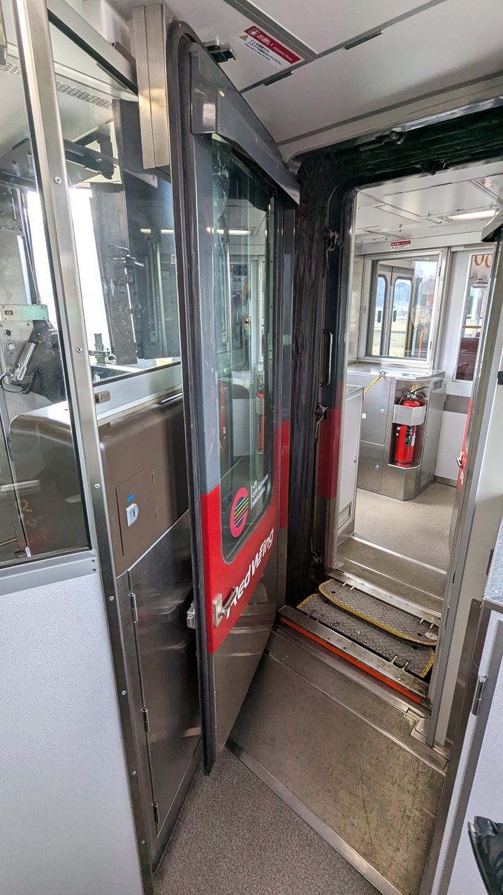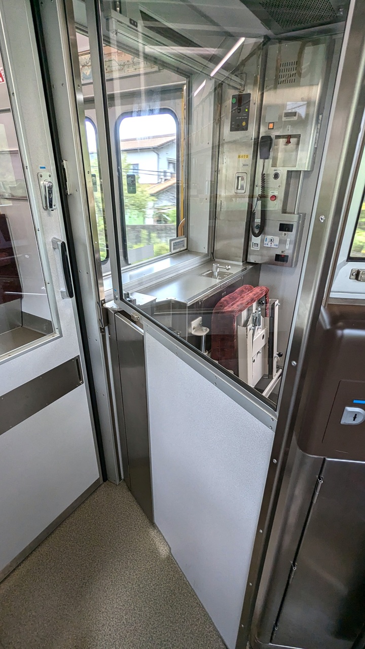 運転席側スペースは前面側に固定していた仕切り扉を回転する形で閉鎖されます。521系などはこの部分に運賃箱も回転する形で収納するため、仕切り扉の下半分には運賃箱の形状に合った切り欠きが設けられていましたが、運賃箱を搭載しない227系0番台・500番台は下半分の面積が拡大されています。しかし、上半分と同じ幅まで拡げると回転時に助士席側の機器と干渉してしまうため、不足する部分は運転席側に収納された小扉(銀色の部分)を展開することで補います。また後述の通り、貫通扉部分は床面がスロープ状に高くなっているため、前面側に固定する際に干渉しないよう、下部に僅かな切り欠きがあるのも分かります。