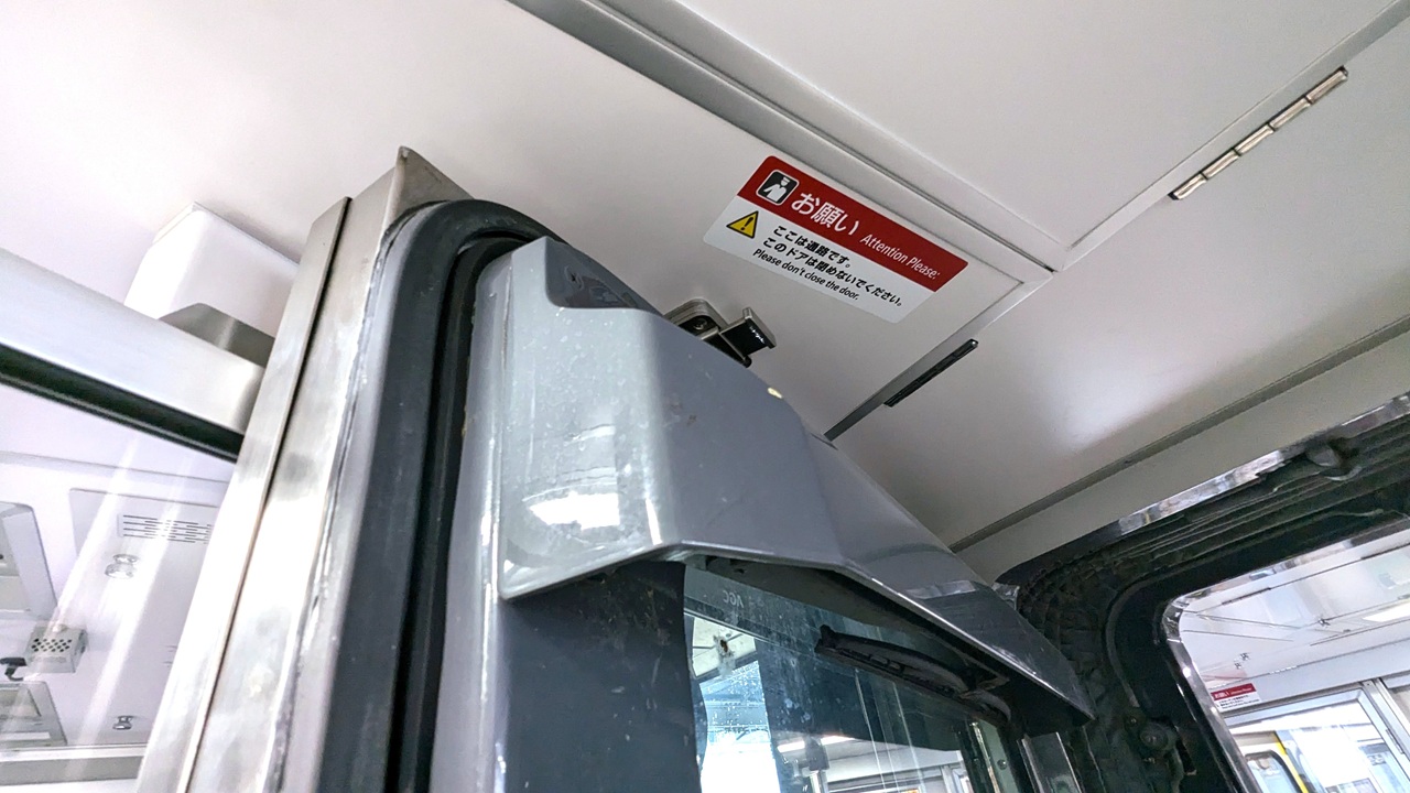 運転台パネル上部の仕切り窓は通常この位置で固定されたままですが、運転席側のロックを外せば貫通扉と同じ方向に回転できる構造になっており、開状態で固定するための磁石が仕切り窓の下部と貫通扉開口部の梁部分に設置されています[3]運転台部分の検査・整備をしやすくするためだと思われる。。