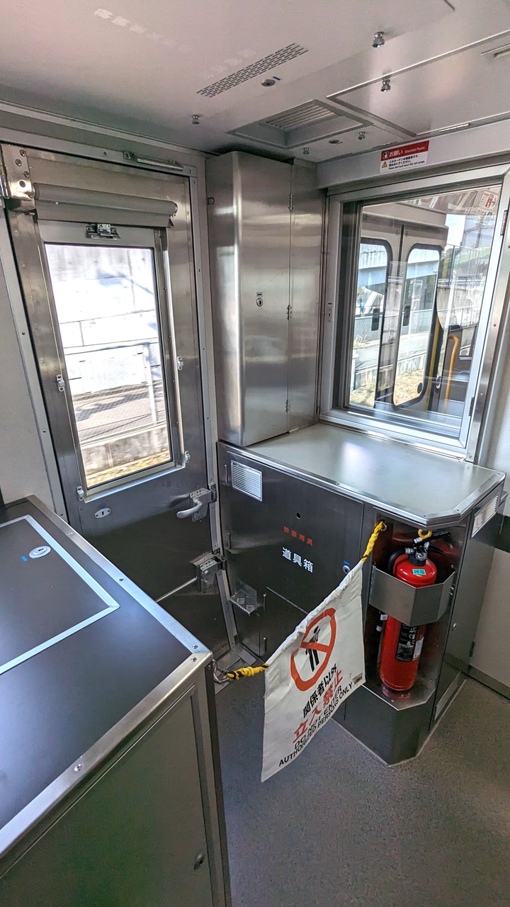 一方、助士席側スペースには仕切りが設けられていないため、助士席前面側の各種機器や乗務員扉横のドアスイッチ・マイク等はいたずら防止のカバーで封鎖されています。なお、0番台の運行開始当初はこのスペースも旅客に開放されていましたが、一部の旅客による迷惑行為が多発したことから(詳しくは後述)、2023年ごろから立入禁止扱いとなりました。立入禁止ロープ取り付け用の金具は後付けされた0番台と当初から設置済みの500番台で位置が異なります[2]500番台の前面側の金具は回転収納式になっている。。