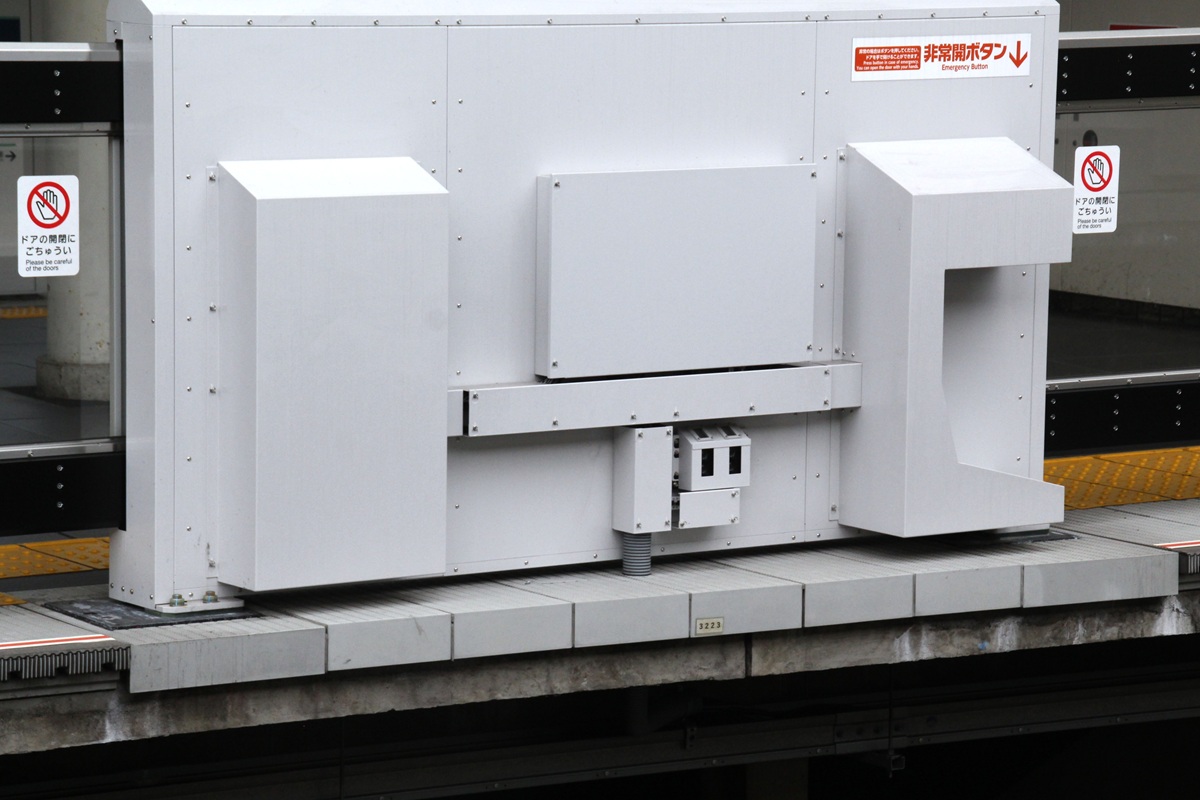 各開口部の線路側には3D式支障物検知センサと非常開ボタンが設けられています。従来品なら内部に収められている配線ダクトなどが筐体線路側に露出しているのも本タイプの大きな特徴です。