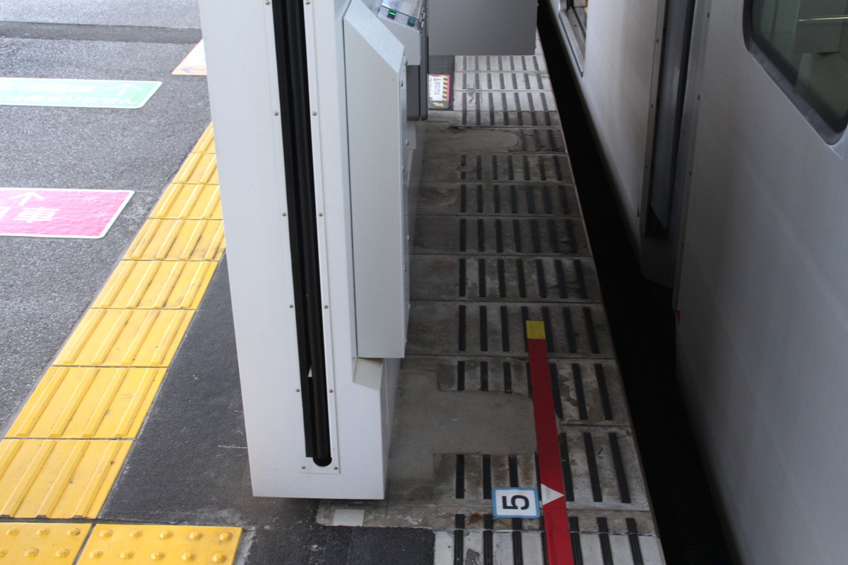 これに伴い、2024年8月頃から12月頃にかけて、5両編成の最前部・最後部となる箇所のホームドア筐体を一時撤去し、乗務員出入りスペースを確保した位置に移設する工事が順次行われました。いずれもホームドア本体は再利用されているようですが、車両とホームドアの間への侵入を防ぐ部材が大型化されています。