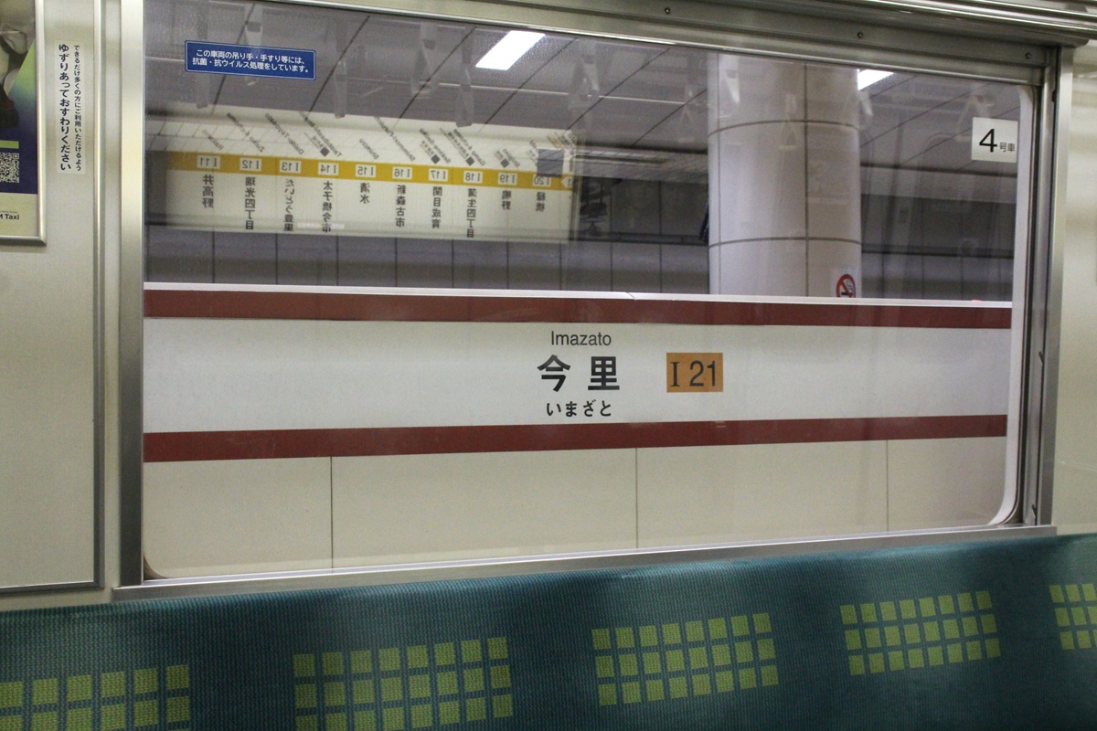 筐体の線路側に貼付されている駅名標は路線のラインカラーではなく、今里駅はブラウン、緑橋駅はグリーンなど、駅ごとに異なるカラーが選定されています。