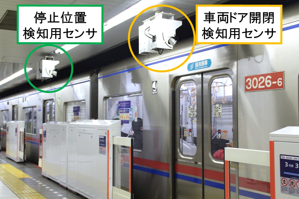 京成のホームドア既設駅は「スカイライナー」などに使用されるAE形も発着するため、AE形用と一般車用で停止位置検知用センサが複数個所に設けられていました[5]AE形と一般型車両で車体長が異なることを活用し、連結部の位置の違いで車種判別を行うため。。一方、同駅はAE形が発着しないため、停止位置検知用センサは1ホームにつき1か所のみとなっています。