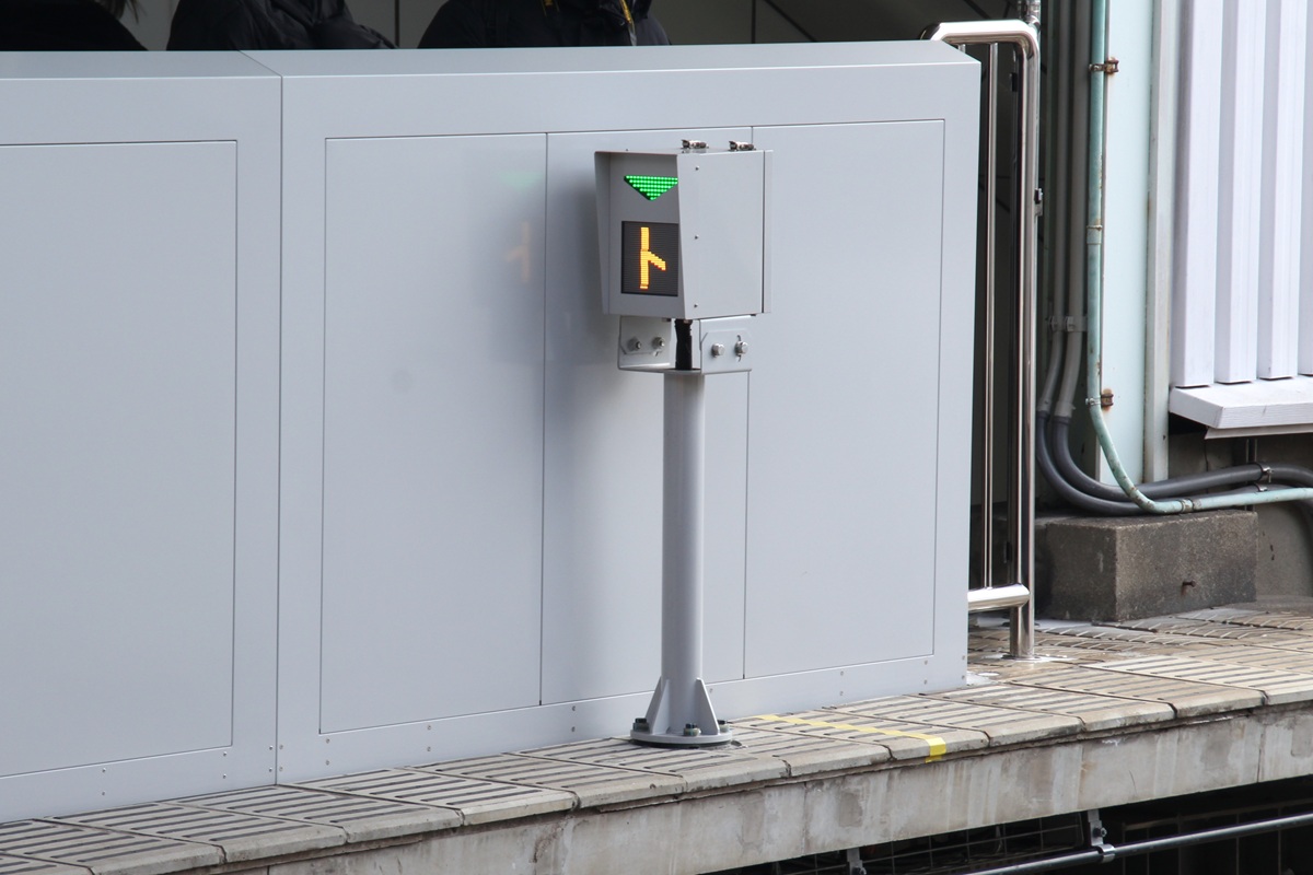 今里筋線などと同じく、停止位置前方には出発反応標識と一体になった「出発指示合図表示器」が設けられており、ホームドアの開閉状態・出発指示合図・戸閉タイミングなどを運転士および駅係員に伝達します。