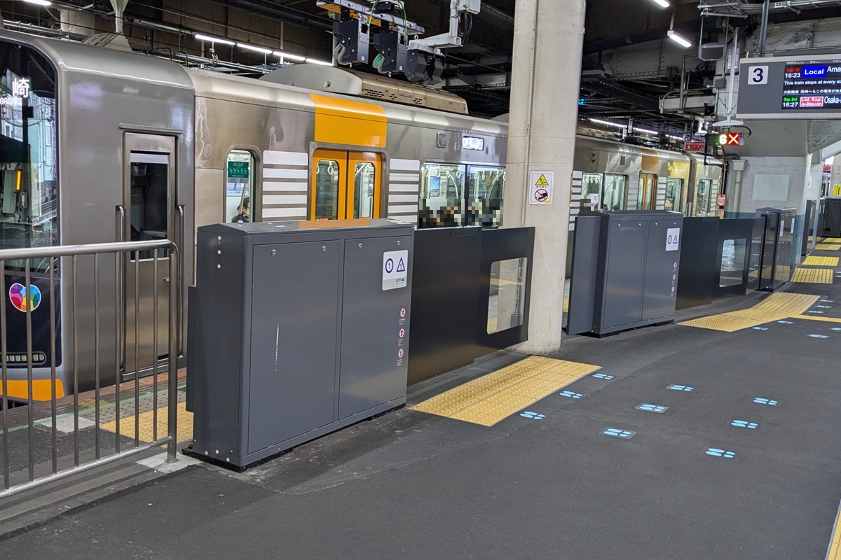 鶴橋駅3番線のホームドアは、地上側の設備のみで車両の動きに追従した自動開閉を行う「地上完結型連携システム」によって制御されています。開扉だけでなく閉扉も自動化されているのが同駅2番線との違いです。