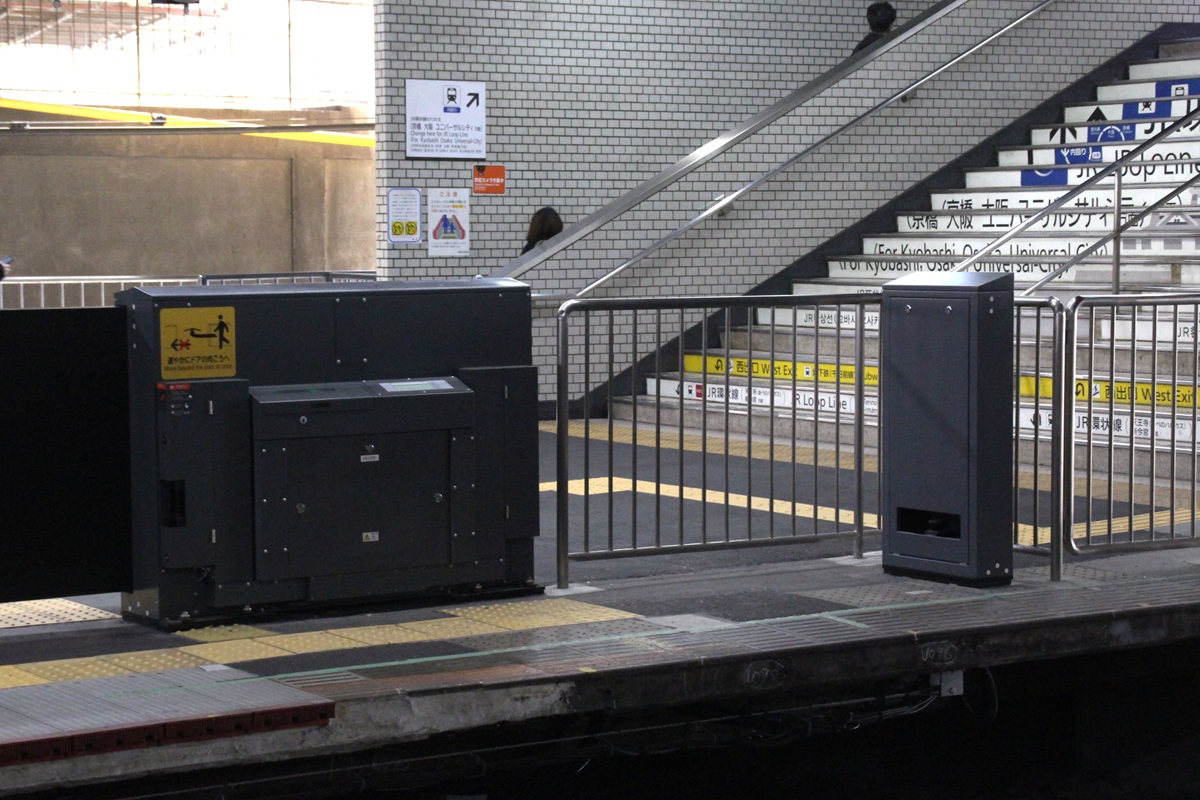 3~4号車付近にもJR大阪環状線(天王寺・新今宮方面)のりかえ改札口へと繋がる階段などがあり、2号車付近ほどではないものの余裕の少なさが続きます。そうした箇所では二重引き戸タイプではなく筐体厚みの小さい一重引き戸タイプを採用するなど、筐体配置の工夫によってホーム内側の幅員を確保しています。