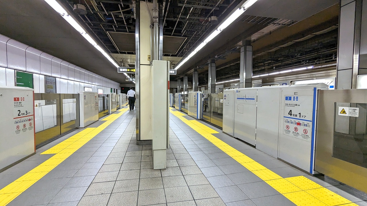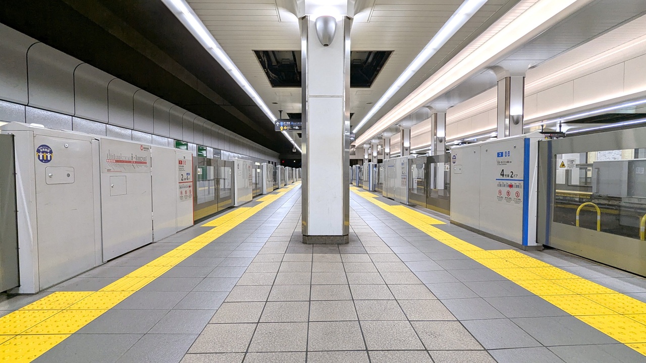 大国町駅は御堂筋線と四つ橋線が同一ホーム上で対面接続するため、同じタイプのホームドアであることがよく分かります。