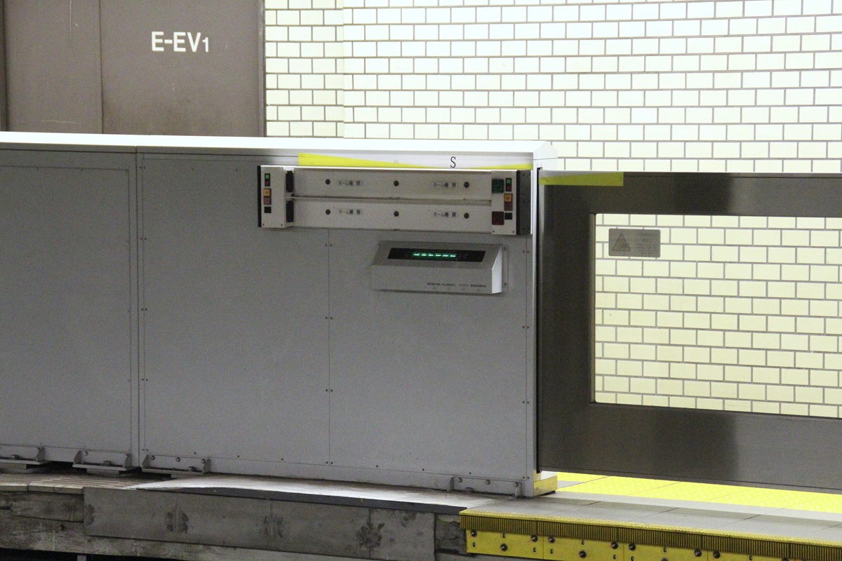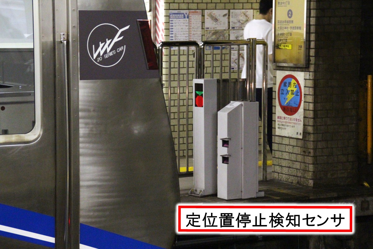 かつては車両側がホームドア連携に対応していなかったため、先行導入駅では停止位置前方に設けられたセンサで列車の定位置停止を検知して自動開扉、閉扉は車掌による手動操作で行う方式が採用されていました。なお、これは当時の御堂筋線と同じ方式であり、光電センサ式の乗務員操作盤や乗務員向け表示灯の表示内容なども共通していました。