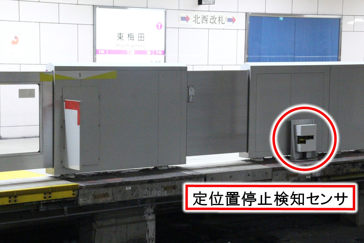 かつては車両側がホームドア連携に対応していなかったため、東梅田駅では停止位置前方に設けられたセンサで列車の定位置停止を検知して自動開扉、閉扉は車掌による手動操作で行う方式が採用されていました。一方、本格導入駅では連携化までの暫定措置として定位置停止検知センサを設けず、開閉ともに車掌による手動操作での運用となり、同時期に東梅田駅でも自動開扉機能が停止されました。