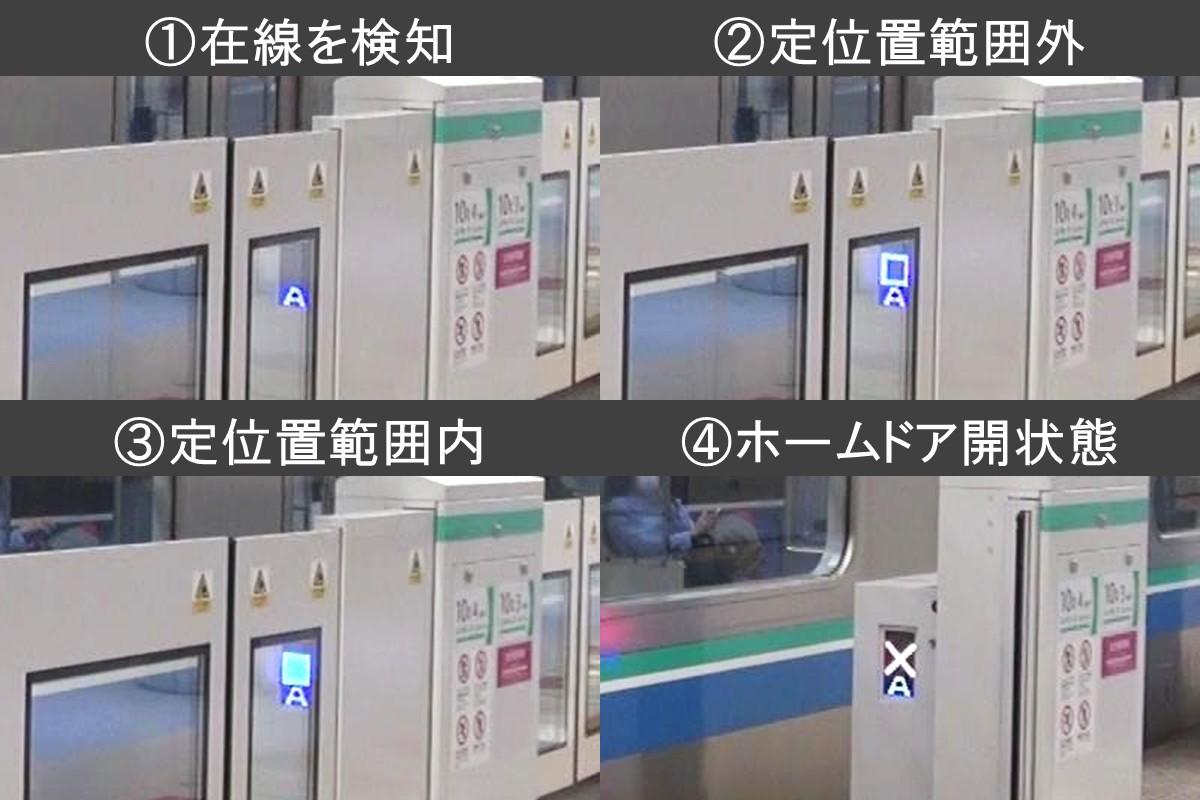 ホームドアの開閉状態などを示す表示灯は運転士用と車掌用がそれぞれ設けられており、車掌用は筐体センサボックスに内蔵されています。列車発着時における表示の推移は以下の通りです。