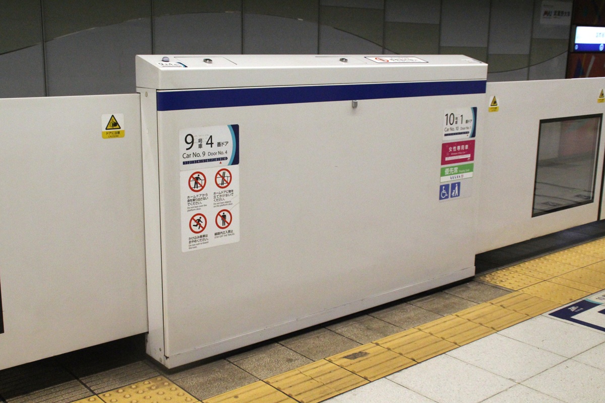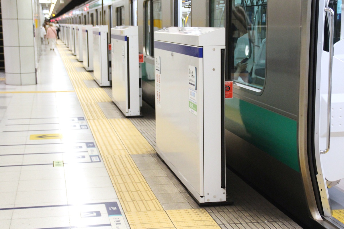 ホームドアのタイプは一般的な腰高式、メーカーは三菱重工交通機器エンジニアリング[1]現:三菱重工交通・建設エンジニアリングです。基本的な構造は2017年度に京成電鉄日暮里駅下りホームで整備された同社製ホームドアと類似しています。