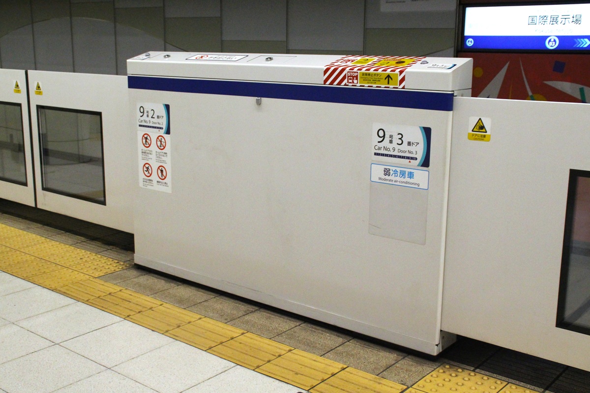 ちなみに、国際展示場駅に設置された当時は相模鉄道横浜駅を抜いて在来線のホームドアで最大の開口幅となったのですが、わずか数ヶ月後には京成電鉄日暮里駅上りホームでさらに巨大な開口が登場しました。